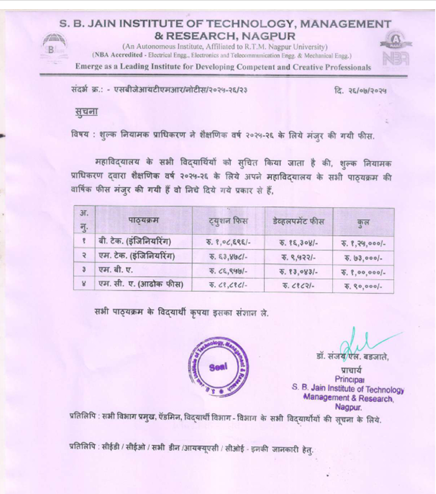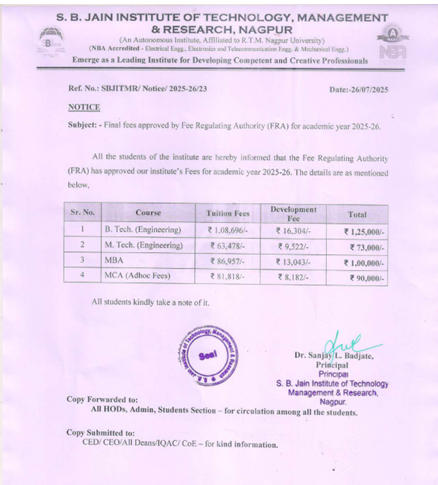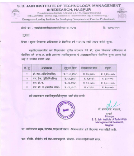 DD in favor of “S. B. Jain Institute of Technology, Management & Research” Payable at NAGPUR